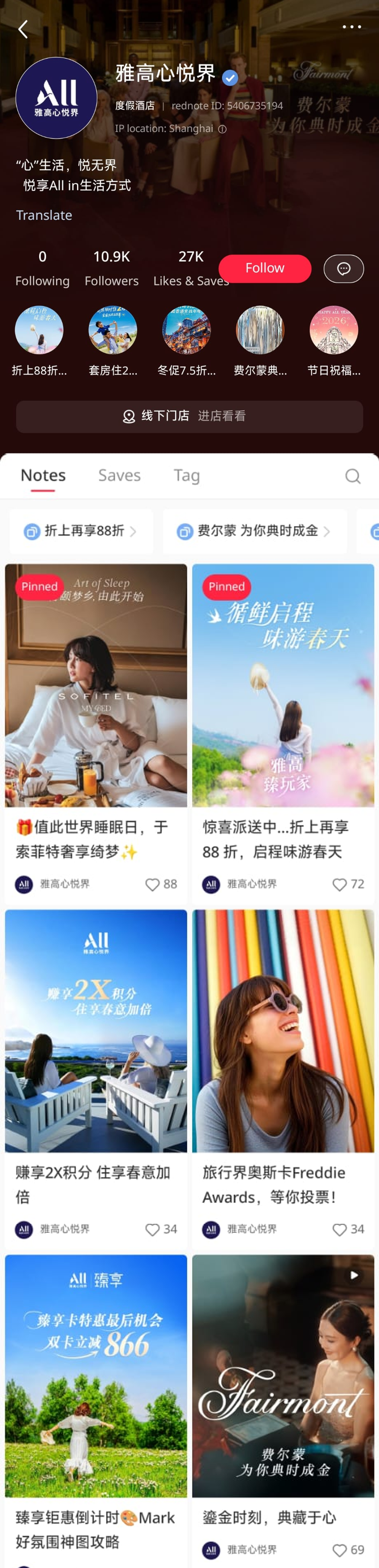 ← The Accor Xiaohongshu account focuses heavily on travel inspiration, hotel experiences, and lifestyle content rather than direct hotel promotion.