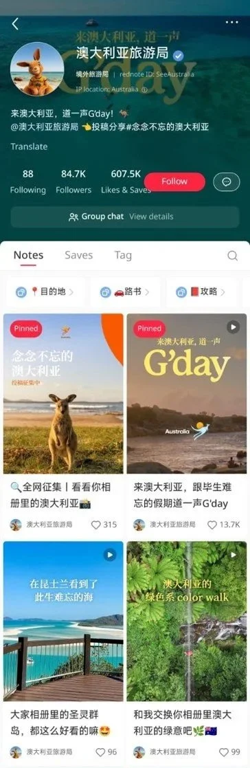Tourism boards and destination marketing organisations are some of the most active official accounts on Xiaohongshu. The platform is widely used by Chinese travellers to research destinations, plan trips, find photo locations, and discover cafés, hotels, and itineraries. Because of this, Xiaohongshu has become an important platform for destination marketing.